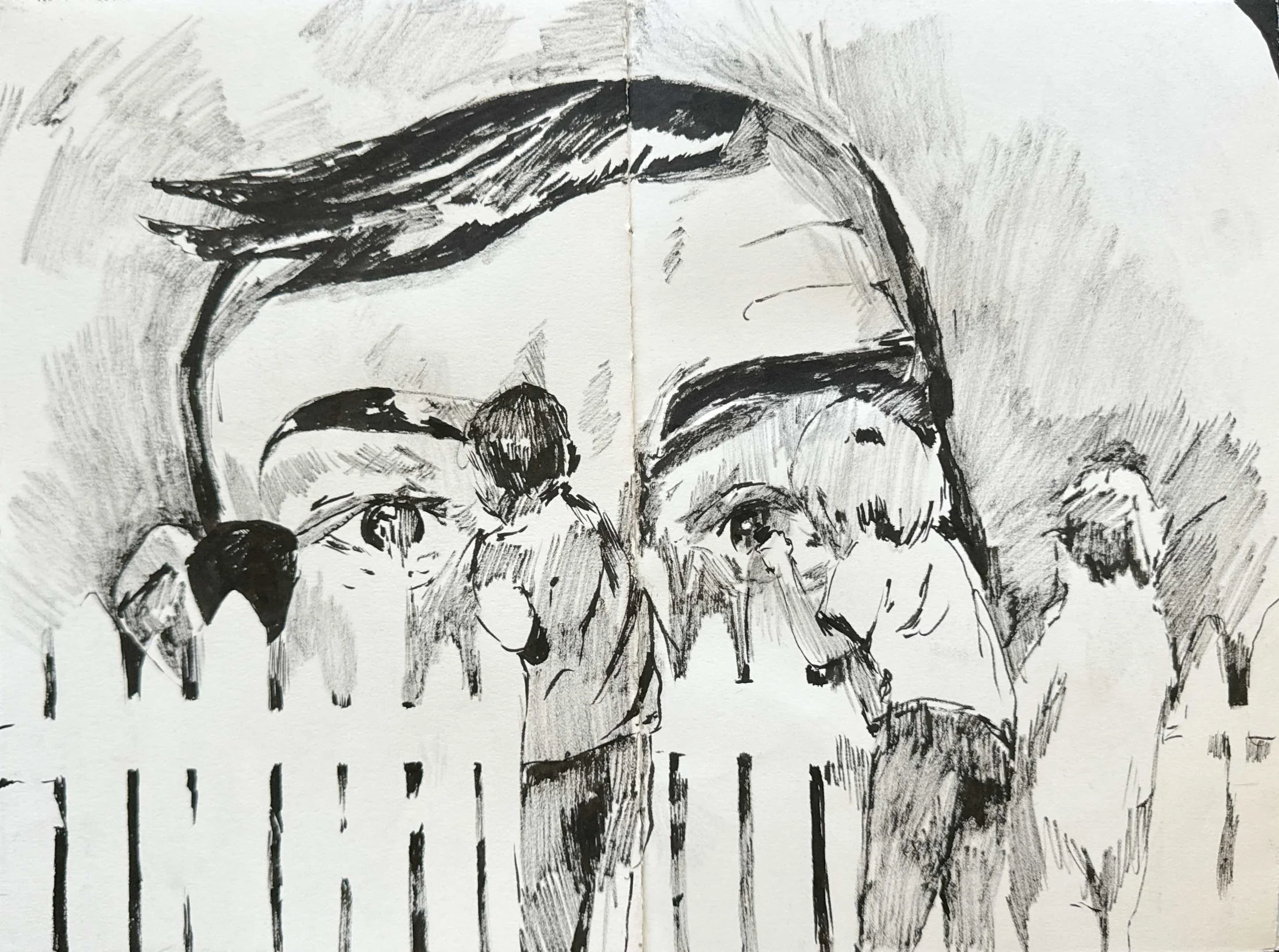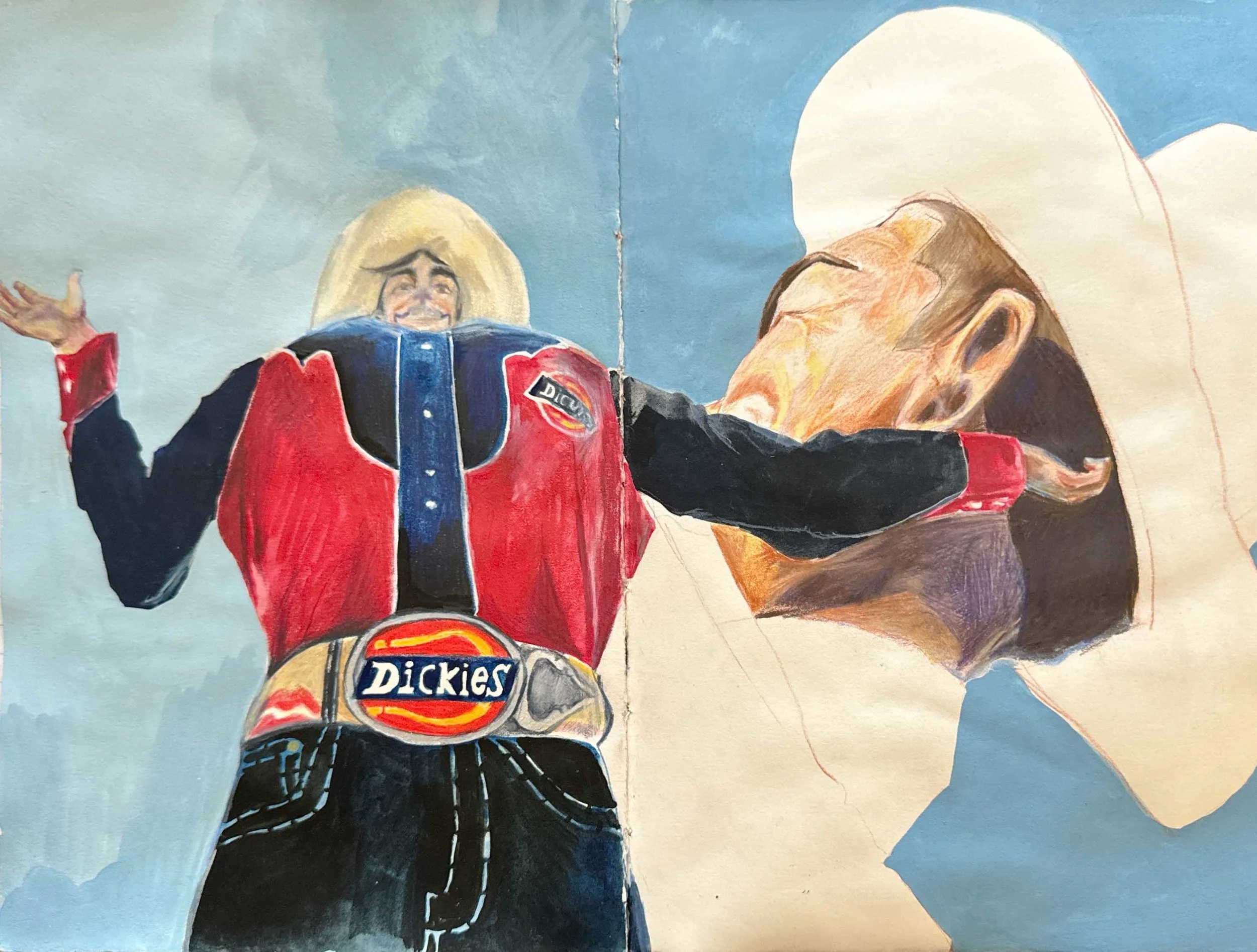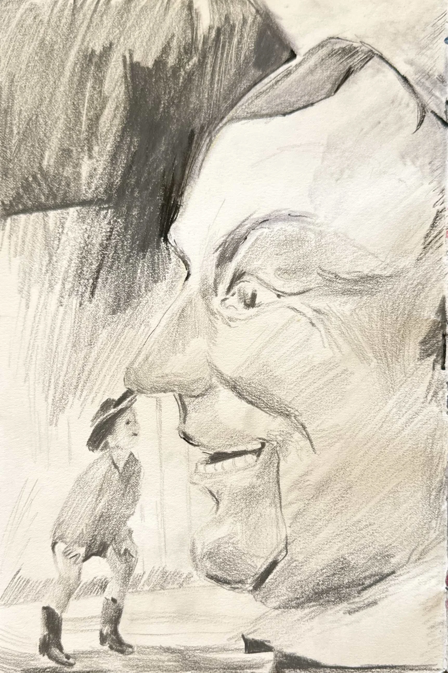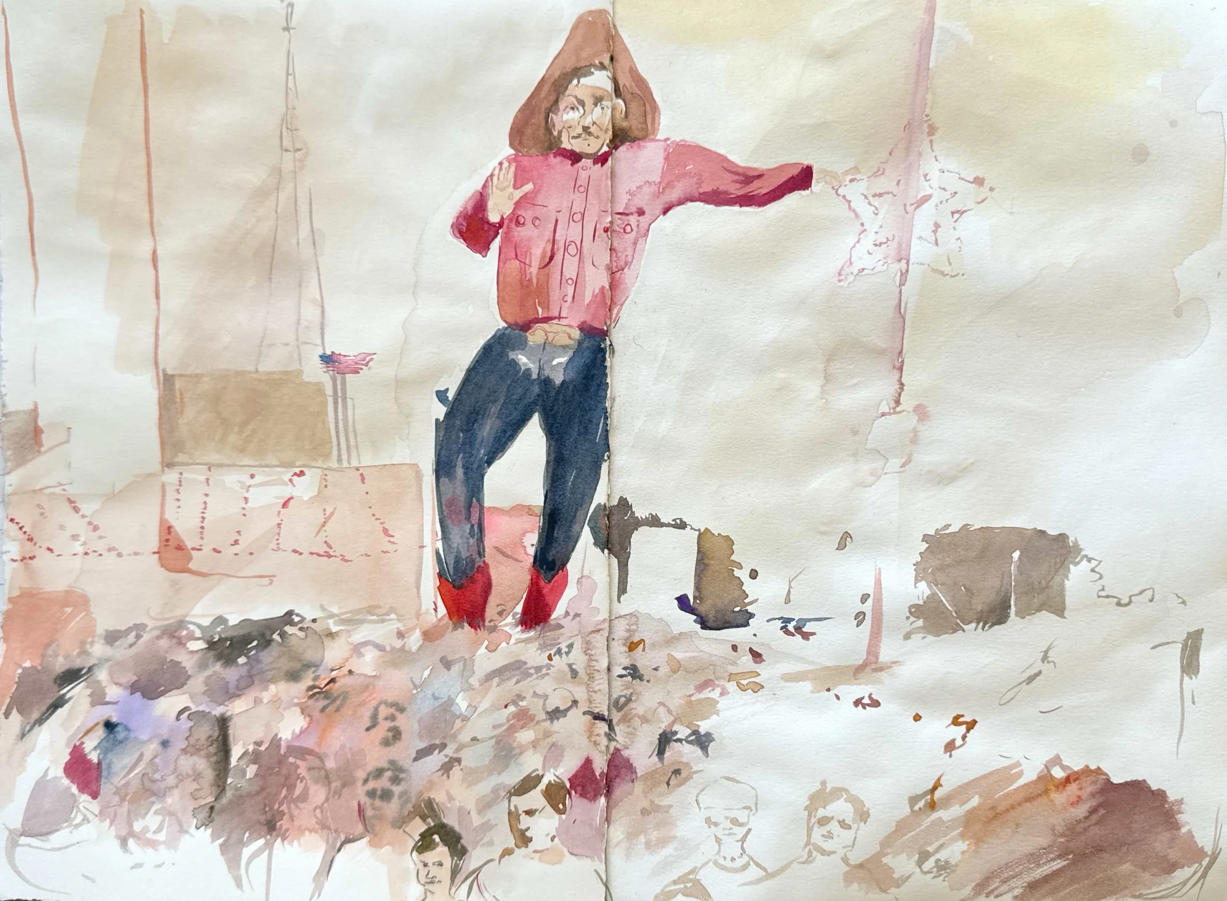 Big Tex — handmade sketchbook, pages each measuring 16”x10”. Drawings rendered in gouache, ink, watercolor, graphite, charcoal, and colored pencil. 2025.