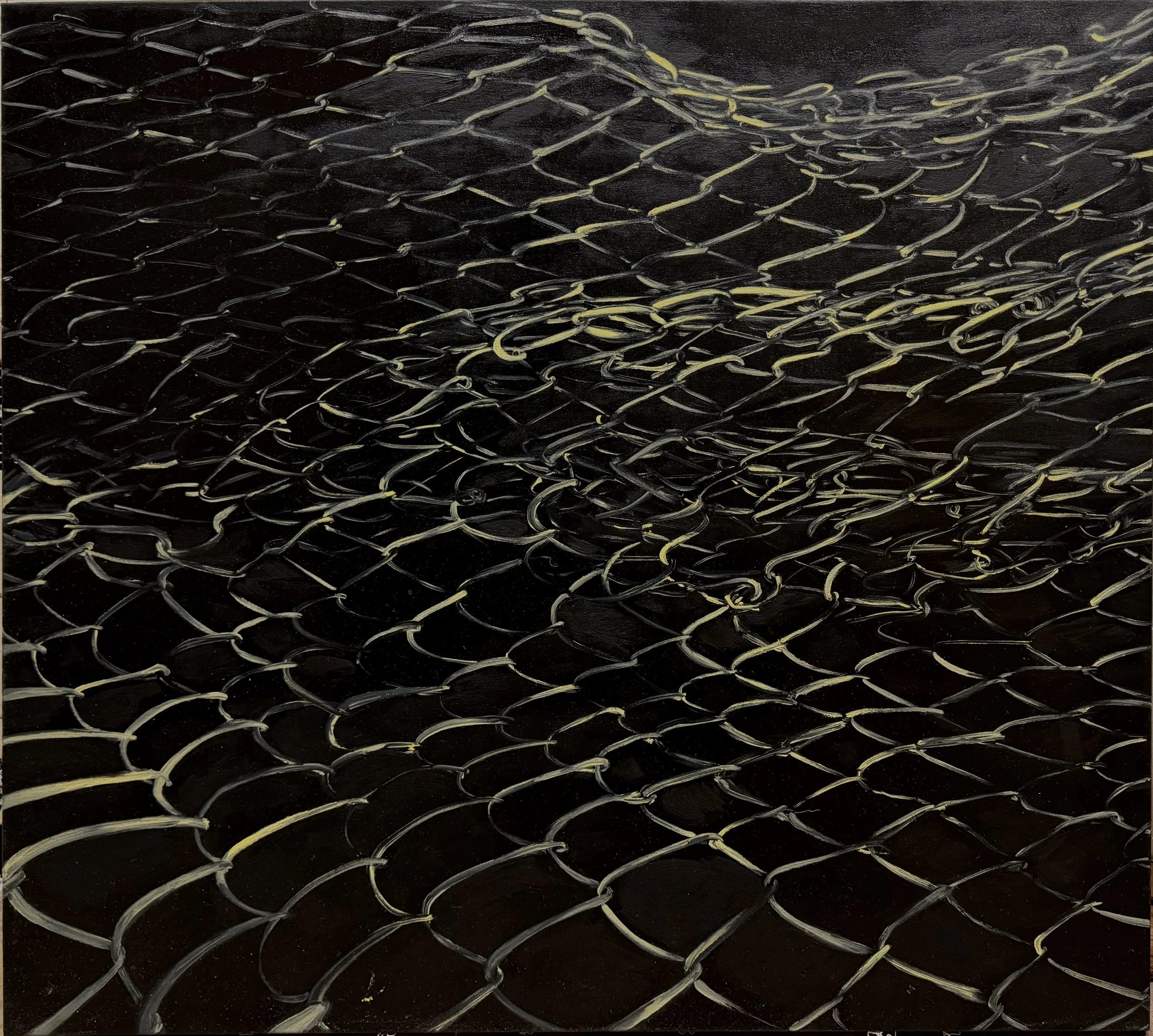 Chain link, oil and Bob Ross Liquid Basecoats black medium on canvas, 48” x 40”, 2024.