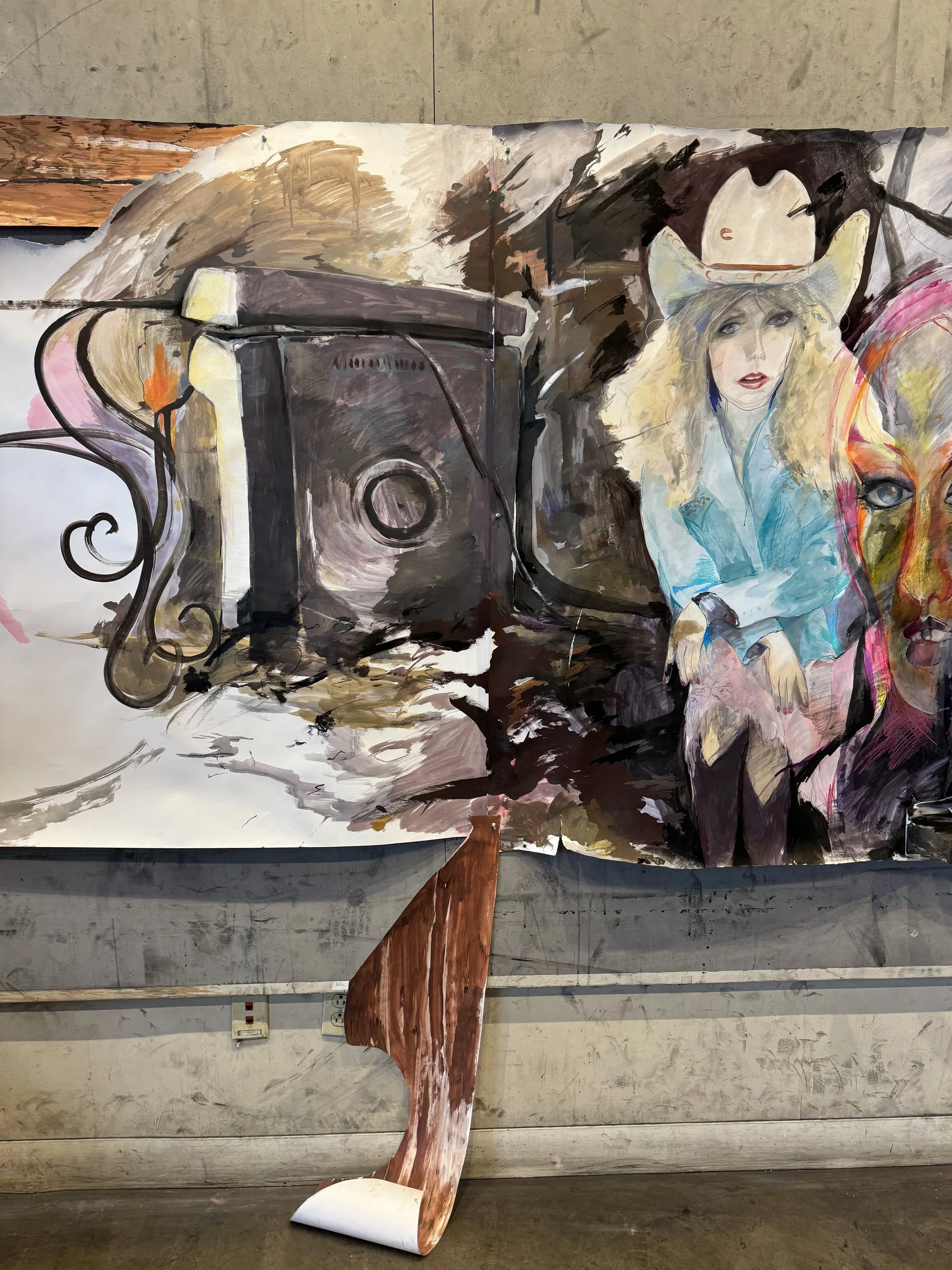 Acrylic, gouache, watercolor, glitter, colored pencil, graphite, charcoal, rust, glue, thumbtacks on paper